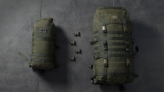 Compartimente si spatiu: Compartiment principal cu doua buzunare lungi si relativ inguste in partea din spate, pe toata inaltimea rucsacului (mai putin partea care se ruleaza). Inel din plastic (D-Ring) fixat in interior pentru a prinde diverse obiecte sau a le asigura. Compartiment exterior (deschis) pe spatele rucsacului in care se poate pune sistemul de hidratare, un suport pentru rigidizare (cum este Savotta MPP Foam Mat), o prelata tarp sau alte accesorii plate. Acest compartiment are colturile de jos decupate pentru a putea introduce bretelele si a pastra rucsacul intr-o forma cat mai compacta (asa cum este si furnizat de fabrica). Tipul de inchidere al rucsacului poate varia usor capacitatea acestuia. Chingi PALS sunt montate pe partea frontala pentru atasarea unor genti separate (module) sau teci echipate cu sistem MOLLE dar si echipament, unelte, carabine, corzi elastice etc. Marginea fundului rucsacului este prevazuta cu patru inele din chinga pentru a putea fixa echipament (saltea, patura, haina..) cu ajutorul unui snur elastic (disponibil separat).