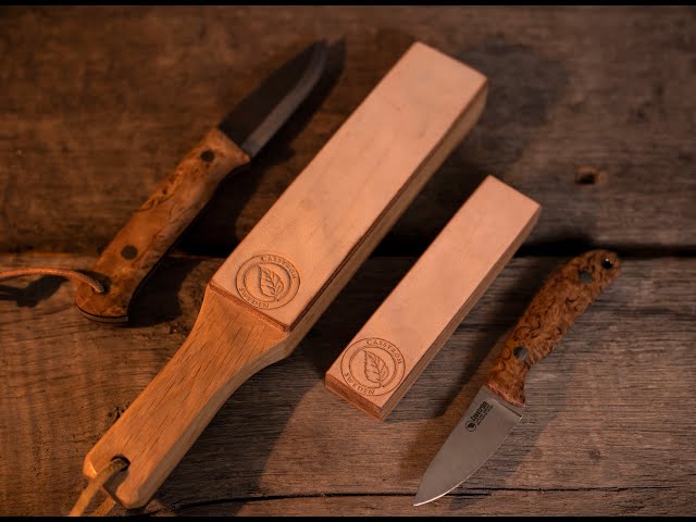 Casström Field Strop. Strop mic din piele si lemn pentru ascutire in teren si EDC. 135x33mm. Are doua fete lipite pe o bucata din lemn. Una dintre fete este fina si una aspra (piele intoarsa). Pasta abraziva (compound, strop paste) se aplica pe una dintre fete sau pe ambele; in acelasi timp ambele fete se pot lasa fara pasta dar efectul este mult mai redus sau implica mai multa finisare prealabila.